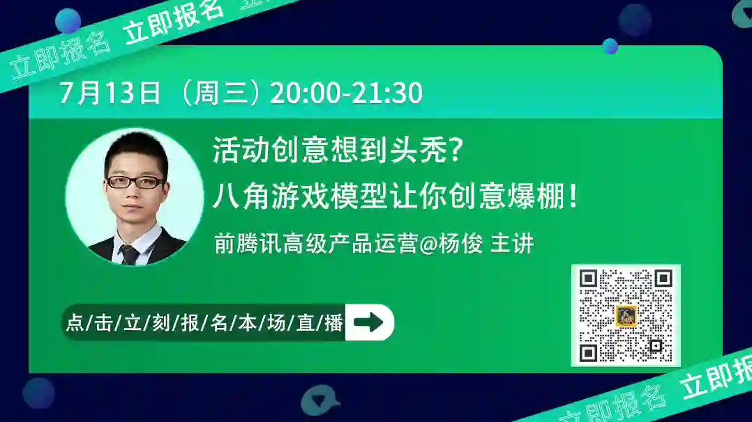 7月13日(本周三)20:00我们邀请了前腾讯高级产品运营,16年资深运营大咖@杨俊老师在为大家进行直播分享!