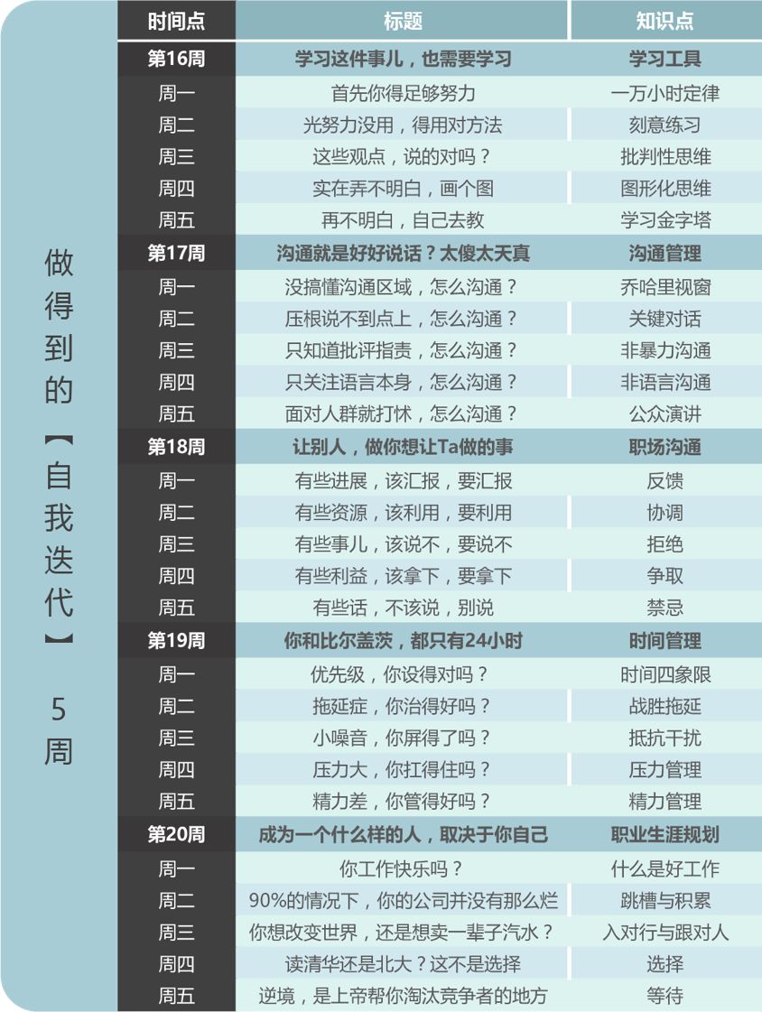 在第一季里,老路为你带来的是100堂全球顶尖名校MBA商学浓缩精华课程;而在最新的第二季,老路为你引进的是50个来自硅谷最先进的工作方法论。
