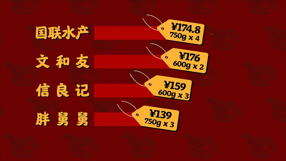 信良记53元/盒、国联水产44元/盒、胖舅舅46元/盒、文和友88元/盒。盒马100块/1500g,折合40元/600g。因为文和友的产品是去头虾尾,可吃部分比较多相对贵。