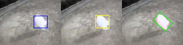 而在物体发生旋转的时候,简单的box的表述通常会产生极大的损失,这实际上就是表述本身存在的缺陷。而为了进一步探索在精度上存在的问题。我们更进一步,直接预测物体的mask。这种表述使得我们可以得到最为准确的box。最直观的利用一个简单的事例的可视化就可以看出,这三种算法的区别(左中右分别是SiamFC | SiamRPN | SiamMask)。