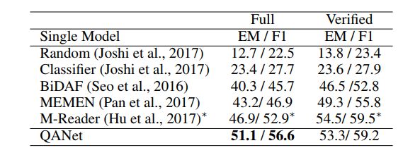 表 7:在 TriviaQA 数据集的 Wikipedia domain 上,不同的单段阅读模型在开发集上的性能。注:*表示测试集的结果。