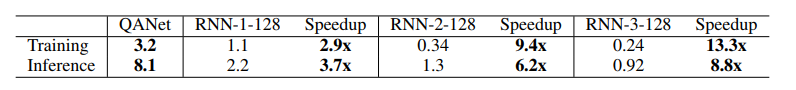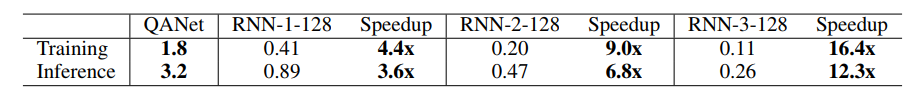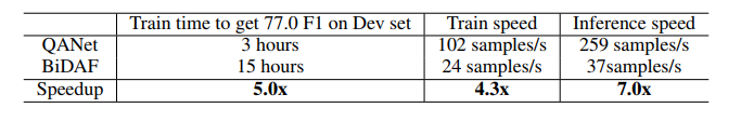 表 4:QANet 模型和 BiDAF 模型(Seo et al., 2016)在 SQuAD 数据集上的速度对比。