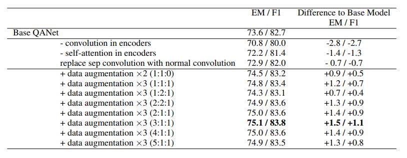 表 5:对数据增强和 QANet 模型中其它部分的模型简化测试。这里所展示的结果是在开发集上取得的。对于包含「data augmentation」条目的行,「×N」表示数据被增大到原始规模的 N 倍,而括号中的比率表示采样率,即原始数据、「英语-法语-英语」和「英语-德语-英语」数据的采样比例。