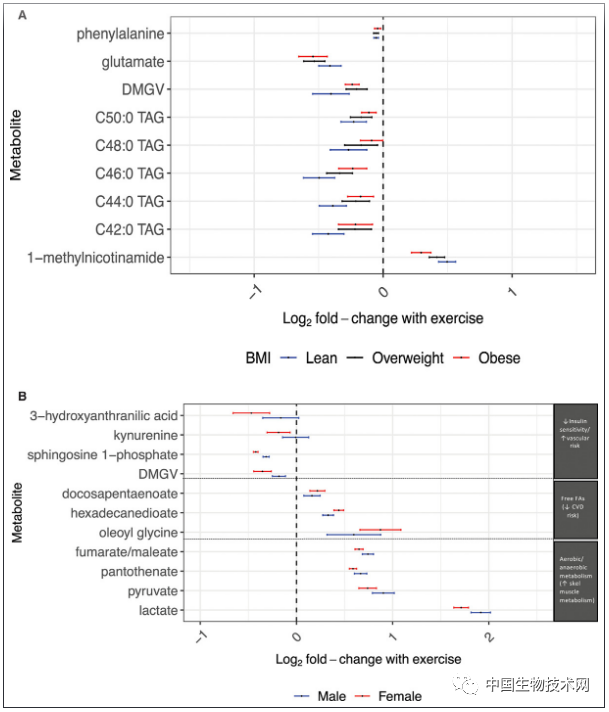 研究人员观察到 588 种代谢产物中的 502 种循环水平发生了变化,从休息到运动高峰(运动持续时间 11.9±2.1 分钟)。这些代谢产物的静息水平此前被证明与心脏代谢疾病有关。例如,与心脏病、糖尿病和寿命减少有关的关键代谢产物谷氨酸下降了 29%;与增加糖尿病和肝病风险相关的代谢产物二甲基胍基戊酸(DMGV)下降了 18%;与脂解相关的代谢物1-甲基烟酰胺增加了 33%;脂肪褐变增加了 26%,以及其他与心脏代谢风险相关的途径。