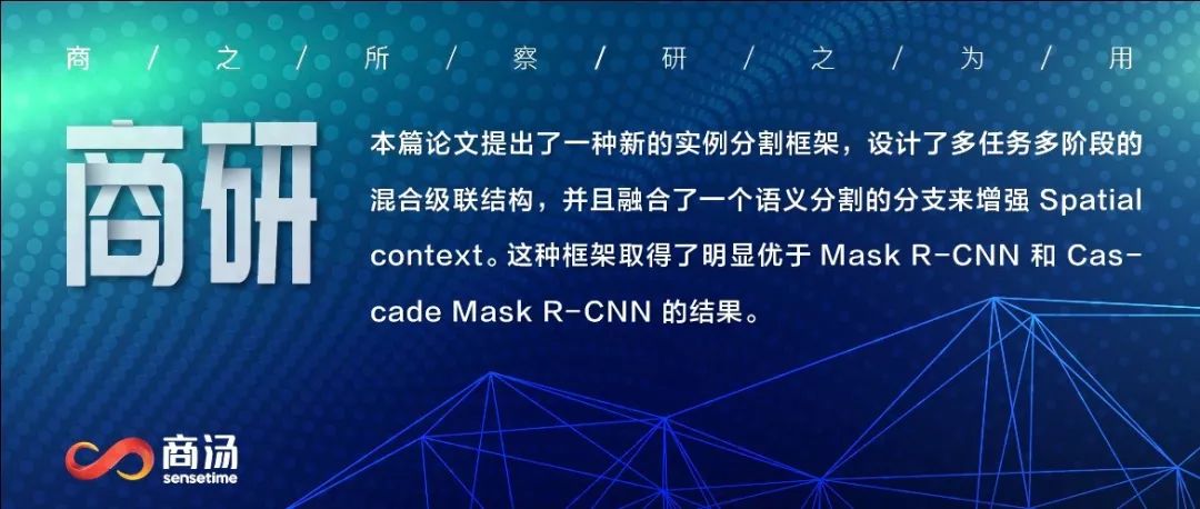 在本篇论文中,我们提出了一种新的实例分割框架,设计了多任务多阶段的混合级联结构,并且融合了一个语义分割的分支来增强Spatial Context。这种框架取得了明显优于Mask R-CNN和Cascade Mask R-CNN的结果。