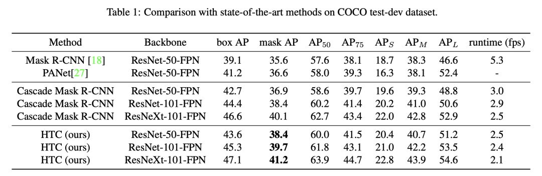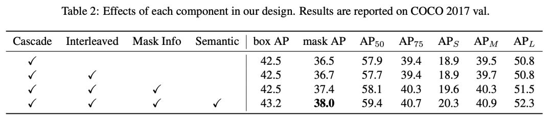 通过上面的几步,在使用ResNet-50的Backbone下,相对Cascade Mask R-CNN可以有1.5个点的Mask AP提升,相对Mask R-CNN可以有2.9个点的提升。在COCO 2017 val子集上的逐步对比试验如下表所示。