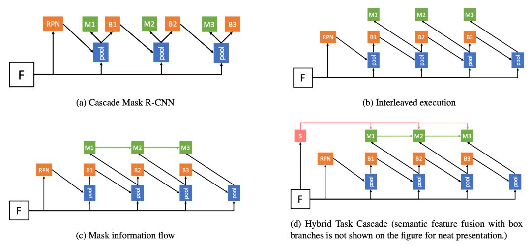 整个框架的演进可以用四张图来表示,其中M表示Mask分支,B表示Box分支,数字表示Stage,M1即为第一个Stage的Mask分支。