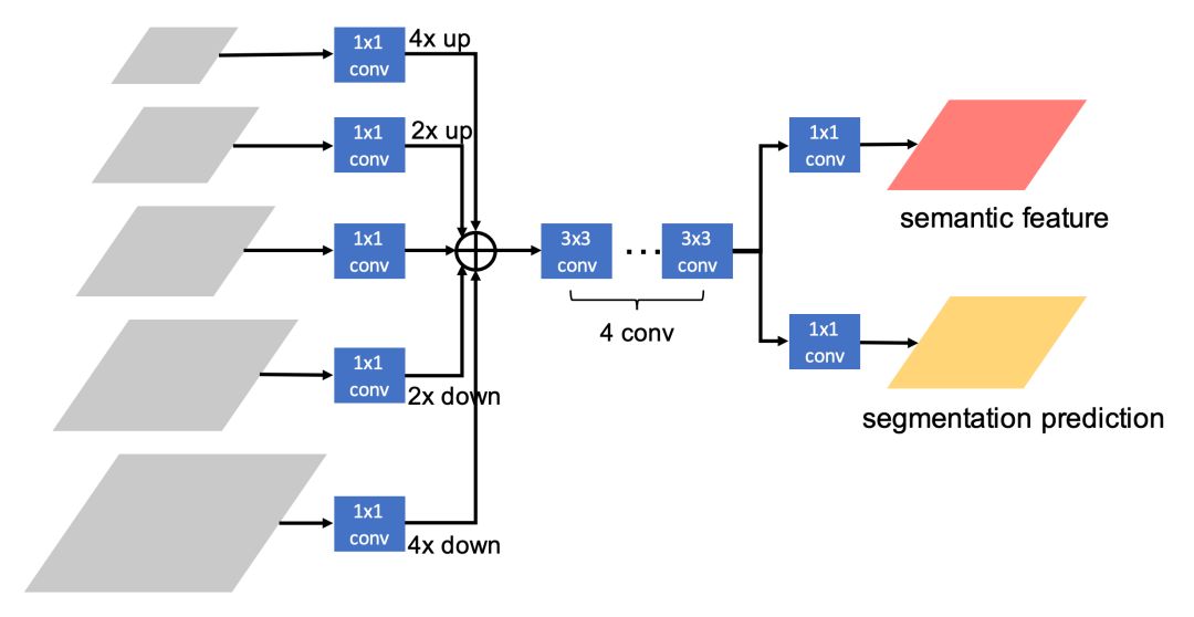 在具体设计上,为了最大限度和实例分割模型复用Backbone,减少额外参数,我们在原始的FPN的基础上增加了一个简单的全卷积网络用来做语义分割。首先将FPN的5个level的特征图Resize到相同大小并相加,然后经过一系列卷积,再分别预测出语义分割结果和语义分割特征。这里我们使用COCO-Stuff的标注来监督语义分割分支的训练。红色的特征将和原来的Box和Mask分支进行融合(在下图中没有画出),融合的方法我们也是采用简单的相加。