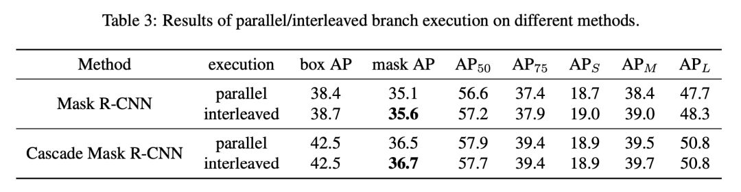 Cascade R-CNN虽然强行在每一个Stage里面塞下了两个分支,但是这两个分支之间在训练过程中没有任何交互,它们是并行执行的。所以我们提出Interleaved Execution,也即在每个Stage里,先执行Box分支,将回归过的框再交由Mask分支来预测Mask,如上图(b)所示。这样既增加了每个Stage内不同分支之间的交互,也消除了训练和测试流程的Gap。我们发现这种设计对Mask R-CNN和Cascade Mask R-CNN 的Mask分支都有一定提升。