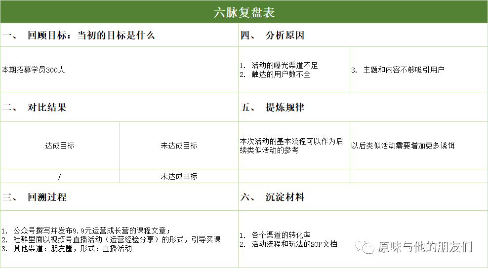 起初定的目标是300人,而实际只招到了260人,对于未达标的活动进行了复盘,通过复盘六脉法找到破局线索。