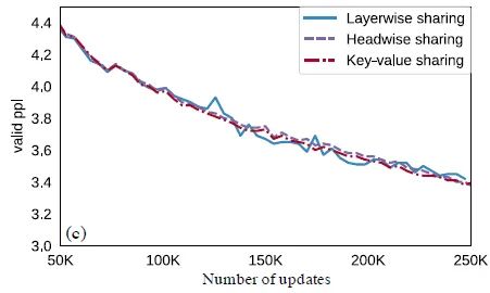 作者比较了3种参数共享策略headwise, key-value, layerwise的影响,如下图所示。图中 。结果发现每一层,每个head的2个Project matrix全部共享参数时与不共享的结果差不多。这意味着我们可以通过全局共享Project matrix参数的方法来大量减少参数量。