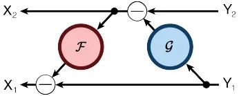 可逆神经网络将每一层分割成两部分,通过将 channel 一分为二,做成两路,分别为 和 ,每一个可逆块的输入是 ,输出是 。其结构如下: