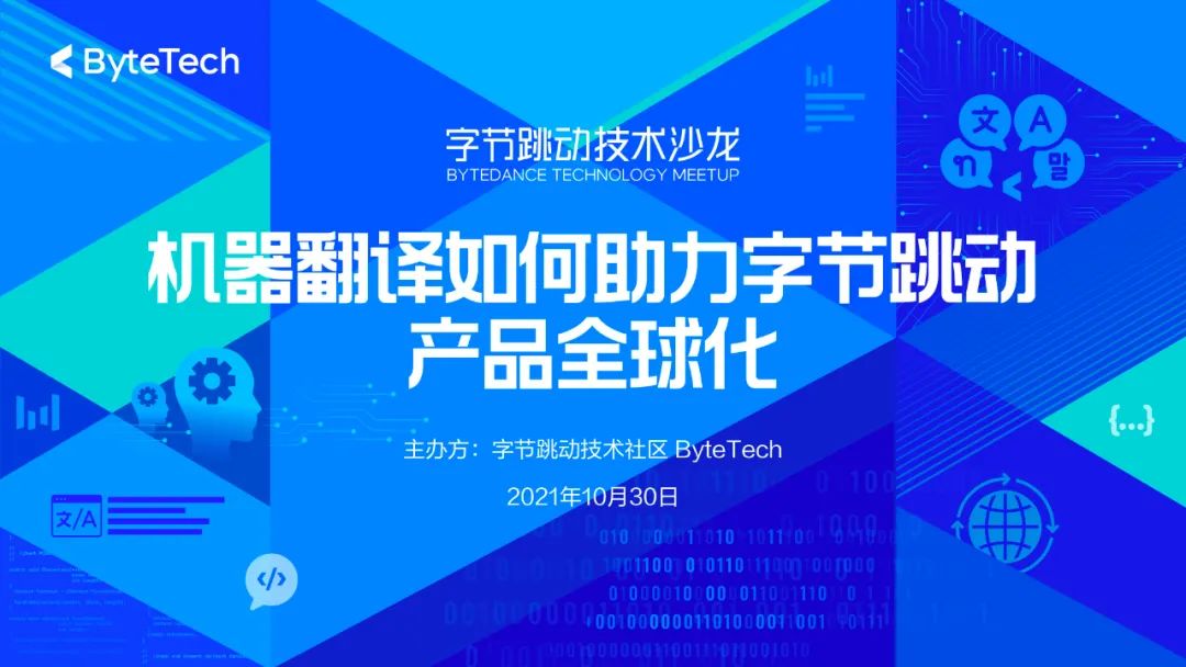 2021年10月30日,字节跳动技术社区ByteTech将主办对外技术沙龙「机器翻译如何助力字节跳动产品全球化」。邀请字节跳动机器翻译领域的技术专家许晶晶、封江涛、程善伯与熊鹰,体系化地展示字节跳动机器翻译技术的全栈能力,特别是机器翻译助力产品全球化的降本增效方案。例如,应用于火山翻译等多个内部业务的训练推理加速引擎 LightSeq、绿色机器翻译词表 VOLT,以及一体化的深度学习框架 ByCha。