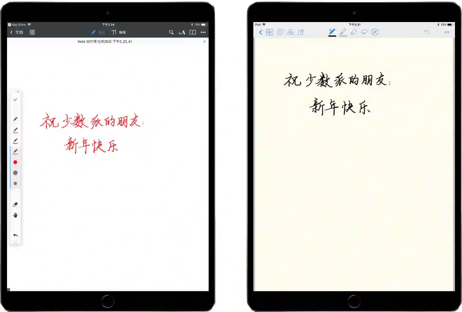 GoodNotes 对墨迹的显示优化做的相当优秀,特别是中文的支持非常出色。熟练之后,可以在屏幕上写出像钢笔字一样有轻有重的比划。与 PDF Expert 未经优化的显示相比差别明显。对比下图的笔迹,可以看出左图的笔迹略显僵硬。对于对笔记外观颇有执念的我来说,这样的功能可谓深得我心。