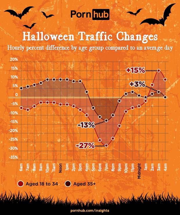 图|之前的万圣节,Pornhub Insights 也发了一份报告,发现晚上时间的流量比平日下滑,大家可能都去 Party 了,但到了深夜流量就比平日来得高。(图片来源:Pornhub Insights)