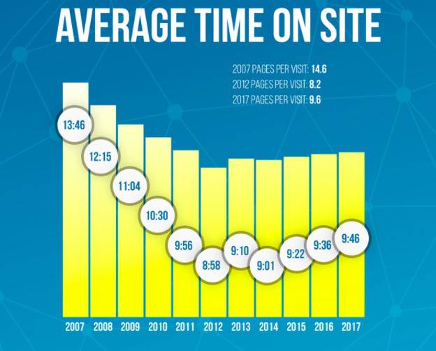 图|今年是 Pornhub 成立 10 周年,回顾过去可以看到用户平均观看几分钟以及变化。(图片来源:Pornhub Insights)