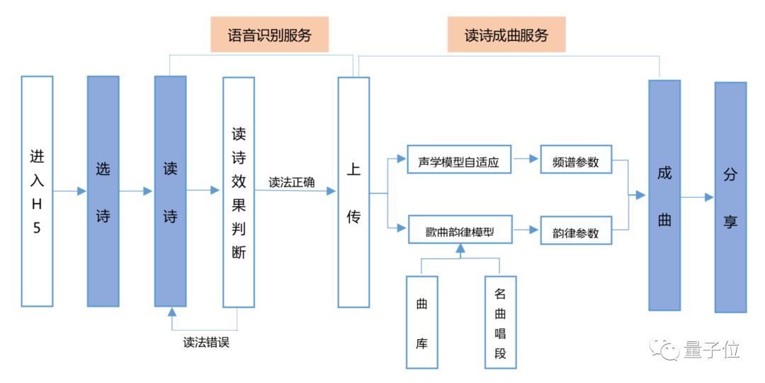 第一步,语音识别。用户按照屏幕提示朗读诗词,系统会先判定读音是否正确,通过后进行如语音合成阶段成曲。