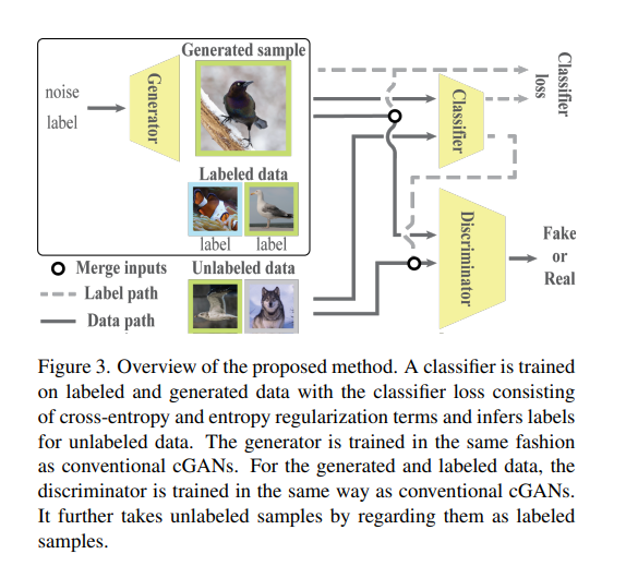 我们介绍了一种具有挑战性的条件GAN训练方案,称为开放集半监督图像生成,其中训练数据集由两部分组成: (i) 标记数据和(ii)未标记数据,其样本属于标记数据类中的一个,即一个封闭集,以及不属于任何标记数据类的样本,即一个开放集。与现有的半监督图像生成任务(未标记数据只包含封闭集样本)不同,我们的任务更加一般化,允许出现开放集样本,从而在实践中降低了数据收集成本。由于熵正则化,在标记数据上训练的分类器能够将cGAN训练的样本明智重要性量化为置信度,允许我们使用未标记数据中的所有样本。我们设计了OSSGAN,它根据未标记图像是否属于感兴趣的类别,为鉴别器提供决策线索,在训练过程中平滑地集成了标记数据和未标记数据。在Tiny ImageNet和ImageNet上的实验结果表明,与有监督的BigGAN和半监督方法相比,有显著的改进。我们的代码可以在https://github.com/raven38/OSSGAN上找到。