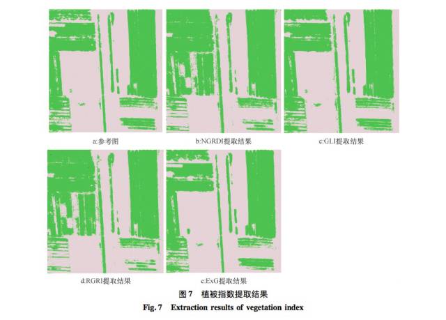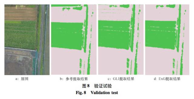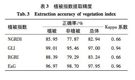一系列试验和验证结果表明,GLI 与 ExG 指数提取精度很高,准确度都大于 97 %,适用于超低空无人机可见光农田影像的植被提取。这种图像处理方法,可以用较小成本获取高精度的植被信息提取结果,对于精准农业、精准喷施、病虫害监测与农情分析等领域有一定的应用价值。