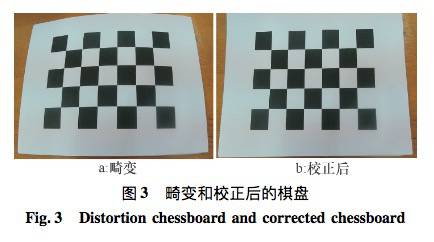 本试验中采用固定棋盘纸而移动相机的方式拍摄,共获得不同角度与深度的棋盘格图像 24 张,并编程求取相机的内部矩阵。畸变棋盘格与校正后的棋盘格的试验图像见图 3。由获得的畸变矩阵校正后的影像见图 4,为保证校正后图像与原图大小一致,采用 1 次插值,并编程调整图像大小。