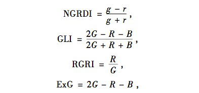 基于可见光的植被指数主要有归一化绿红差异指数( Normalized green-red difference index,NGRDI )、绿叶指数( Green leaf index,GLI )、红绿比值指数( Red green ratio index,RGRI ) 、过绿指数( Excess green,ExG )等。