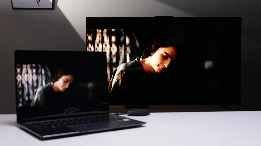 小米投屏器内置了信号转换芯片,可以进行解码投屏,最高支持 4K30 帧的信号输入。使用笔记本和 4K 电视进行连接,在笔记本中选择拓展模式下,电视可以实现 4K 满屏输出,还能利用 PPT 演讲者模式,作为输出端的笔记本还可以显示需要讲解的会议重点。