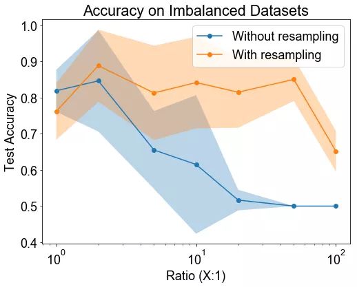 假设:我们预计测试正确率会随着类别不平衡的增加而降低,但我们预计过采样可以缓解这个问题。