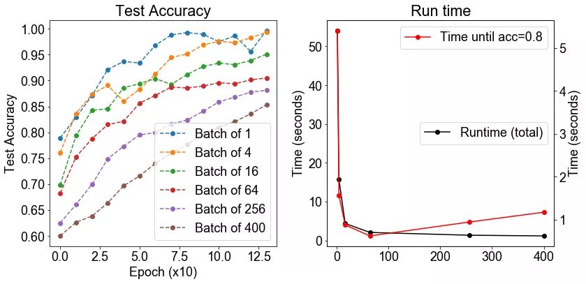 假设: 我们期望较大的批大小会增加正确率(较少的噪声梯度更新),在一定程度上,测试的正确率将会下降。我们预计随着批大小的增加,运行时间应有所下降。