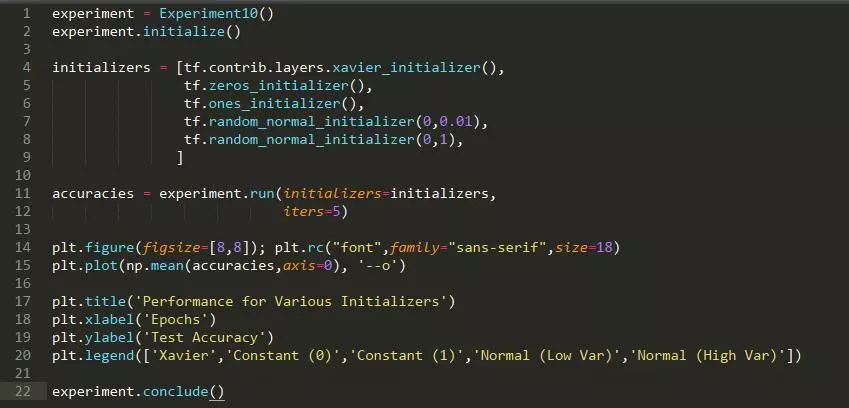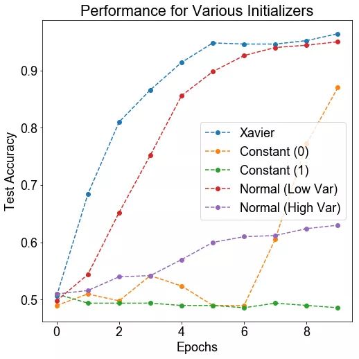 假设: 我们期望 Xavier 损失具有最好的性能(它是 tensorflow 中使用的默认值),而其他方法性能不佳(尤其是不断的初始化)。