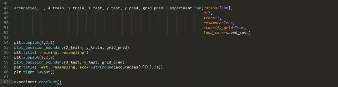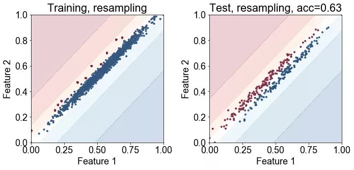 讨论: 重采样法对提高分类正确率有显著的影响,这可能有点让人惊讶了,因为它并没有将分类器展示少数类中的新训练的样本。但该图显示,重采样法足以“助推(nudge)”或将决策边界推向正确的方向。在重采样法不是有效的情况下,那么可能需要复合方式来合成新的训练样本,以提高正确率。