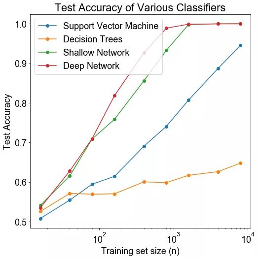 结论: 神经网络在数据集大小方面上表现始终优于 SVM 和随机森林。随着数据集大小的增加,性能上的差距也随之增加,至少在神经网络的正确率开始饱和之前,这表明神经网络更有效地利用了不断增加的数据集。然而,如果有足够的数据,即使是 SVM 也会有可观的正确率。深度网络比浅层网络的表现更好。