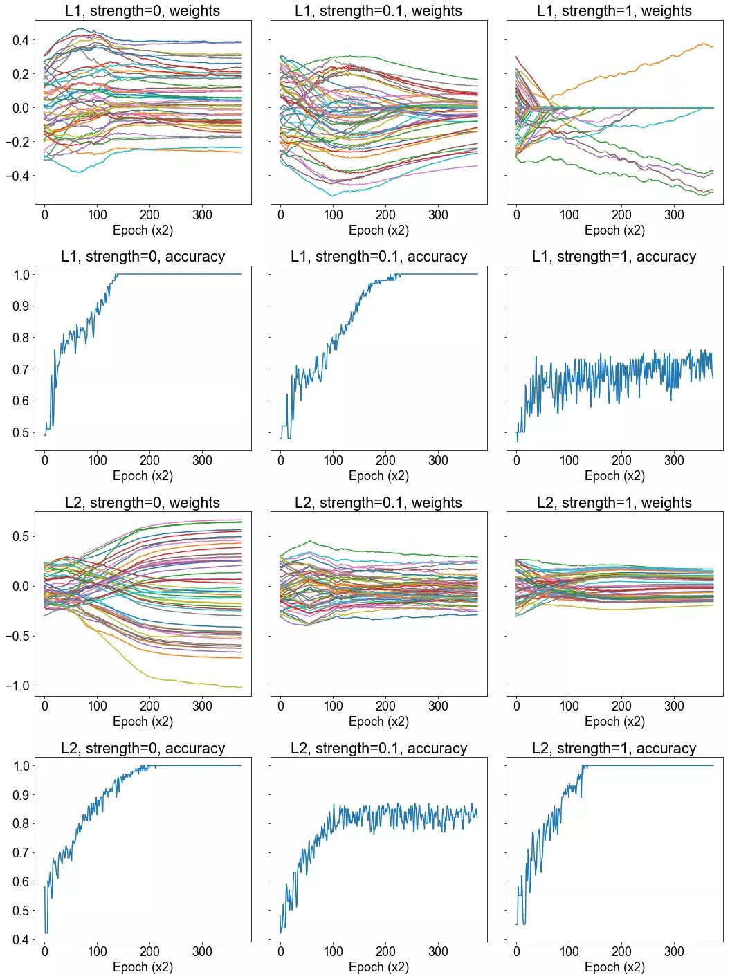 假设: 我们预计在正则化的情况下,权重的大小会降低。在 L1 正则化的情况下,我们可能会得到稀疏的权重。如果正则化强度很高,我们就会预计正确率下降,但是正确率实际上可能会随轻度正则化而上升。