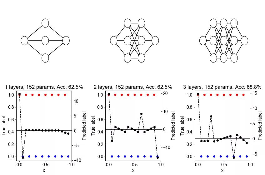 方法: 该数据集由沿着 x 轴的 16 个等距点组成,每对相邻点都属于相反的类。一种特殊类型的深度神经网络(一种跨层共享权重的神经网络)具有固定数量(152)的参数,但测试了层的不同数量。
