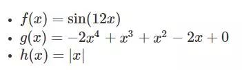 方法:我们将在 50 个数据点 (x,y) 上训练一个 1 层神经网络,这些数据点从域 [-1,1] 上的以下函数中绘制,所得拟合的均方误差(mean square error,MSE)。我们将尝试以下函数(你可随时通过更改以下代码来尝试自己的函数。):