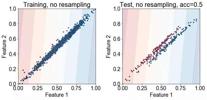 方法:我们生成两个二维的结果(结果未在这里显示,表明相同的结果适用于更高维)高斯,每个产生属于一个类别的数据。两个高斯具有相同的协方差矩阵,但它们的意思是在第 i 个维度上相距 1/i1/i 单位。每个训练数据集由 1,200 个数据点组成,但我们将类别不平衡从 1:1 变为 1:99。测试数据集以 1:1 的比例保持固定,以便于性能比较,并由 300 个点组成。我们还会在每种情况下显示决策边界。