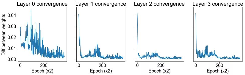 方法: 我们生成两个 12 维高斯混合。高斯具有相同的协方差矩阵,但每个维度上都有一个由 1 隔开的均值。该数据集由 500 个高斯组成,其中 400 个用于训练,100 个用于测试。我们在这个数据集上训练一个带有 3 个隐藏层(将导致 4 层权重,包括从输入到)第一层的权重)的神经网络,我们在训练过程中绘制每层 50 个权重值。我们通过绘制两个轮数之间的权重的差分来衡量收敛性。