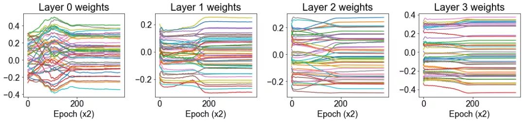 讨论: 看上去第三层的权重是几乎单调地收敛到它们的最终值,而且这一过程非常快。至于前几层权重的收敛模式,比较复杂,似乎需要更长的时间才能解决。