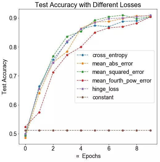结论: 除去阴性对照外,所有的损失都有类似的表现。损失函数是标签与逻辑之间的区别,提升到四次幂,其性能要比其他差一些。