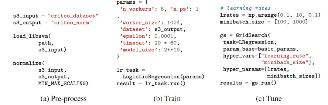 图 1. API 示例。无服务器 ML 的 API 应该支持 ML 开发工作流的不同阶段:(a)预处理,(b)训练,和(c)超参数调优。