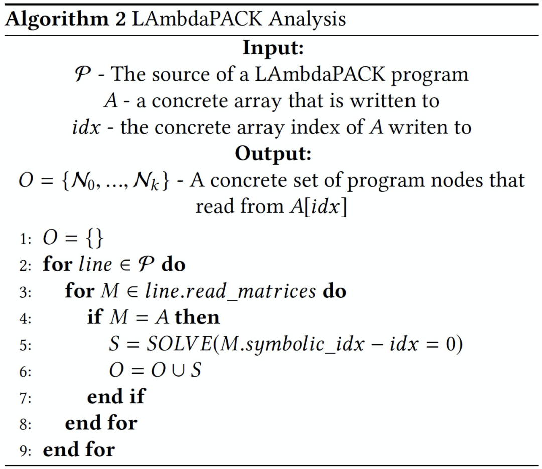 如图 19 中的程序示例,如果在 runtime 一个 worker 正在执行程序的第 7 行,i=0、j=1 和 k=1,以查找下游依赖项,则分析器将扫描这 7 行中的每一行,并计算是否存在一组有效的循环索引,以便在程序中的该点读取 S[1,1,1]。如果是这样,那么元组(line_number, loop_indices)定义了该任务的下游依赖项,并确定为当前任务的子任务。为了便于访问和开发,作者将 LAmbdaPACK 嵌入 Python 中。由于大多数 LAmbdaPACK 调用优化的 BLAS 和 LAPACK 内核,因此使用高级解释语言的性能损失很小。LAmbdaPACK 详细流程见 Algorithm2。