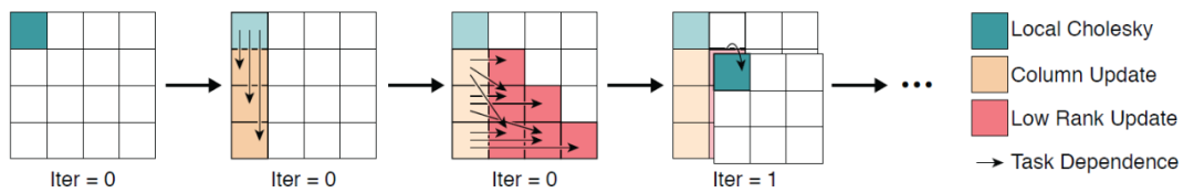 图 16. 并行 Cholesky 分解的前 4 个时间步骤:0)对角块 Cholesky 分解,1)并行列更新,2)并行子矩阵更新,3)(后续)对角块 Cholesky 分解。
