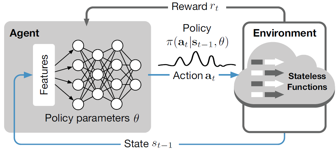 :在本文所描述的问题中,动作表示为 a_t=(n_t, m_t)。n_t 表示激活的函数数量,m_t 表示每个函数的内存大小。DRL agent 根据策略选择操作,策略定义为给定当前状态下整个操作空间的概率分布π(a | s)。作者使用策略梯度方法,通过参数θ的函数来近似策略π(a | s)。因此,策略π可以写成π(a | s, θ),其中θ是要学习的参数。将策略π定义为实值空间的高斯概率密度: