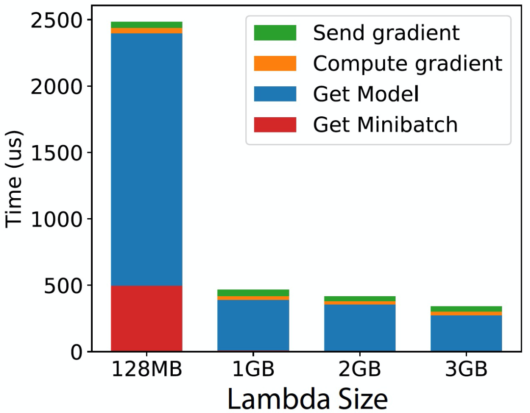 图 3. 本文所提出原型每次 SGD 迭代的时间。具体细分为四个主要步骤:(1)将梯度发送到数据存储,(2)计算梯度,(3)从数据存储获取模型,(4)从 S3 获取 minibatch。