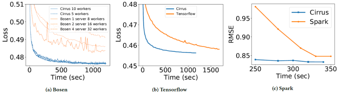 图 7. (a) Bosen 和 Cirrus 之间不同设置的时间损失比较。Bosen 达到的最佳损失为 0.485,Cirrus 达到最佳损失的速度至少快了 5 倍(200 秒 vs 1000 秒)。与最先进的 ML 训练框架相比,Cirrus 可以在一个或两个 Lambda 的寿命内(300-600 秒)更快地收敛,并且损失更低。(b) Tensorflow Criteo_tft 基准和 Cirrus 的收敛与时间曲线。Tensorflow 是在 32 核节点上执行的,Cirrus 在 10 个 Lambda 中运行。(c) 运行 Netflix 数据集时,Spark (ALS)和 Cirrus 的 RMSE 随时间变化曲线。Spark 在运行 Netflix 数据集时,前 4 分钟处理数据,并在 ALS 的 5 次迭代中收敛(RMSE=0.85)后终止。Cirrus 能够更快收敛到较低的 RMSE(0.833)。