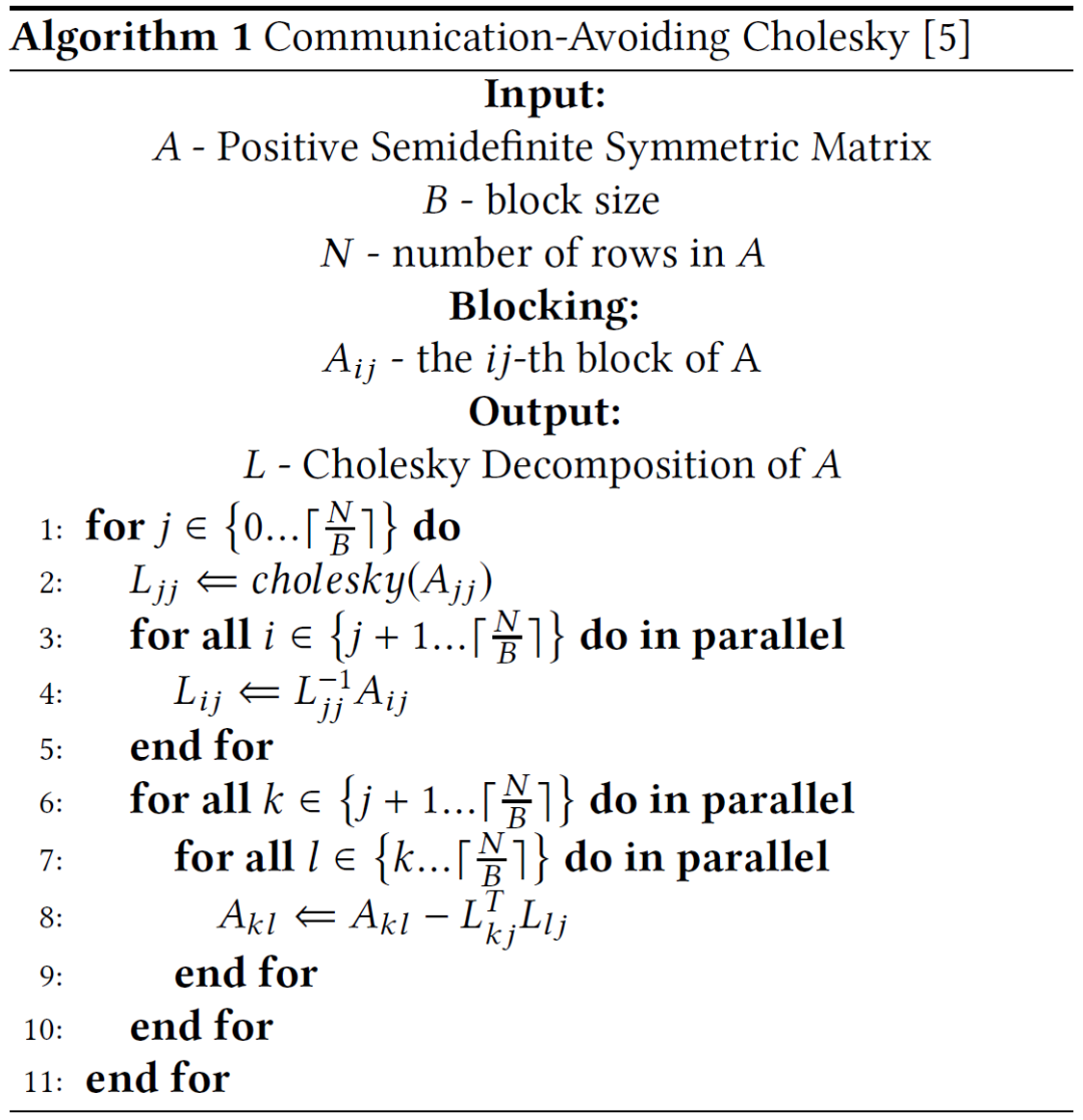 NumPyWren 解决的是类似 Cholesky 分解的线性代数问题。考虑求解线性方程 Ax=b 的问题,其中 a 是对称正定矩阵。我们可以先把 a 分解成两个三角形矩阵 a=LL^T,然后解两个相对简单的 Ly=b 和 L^T x=y 得到解 x。从这个过程中可以看出,分解是该求解问题中计算代价最高的步骤。Communication-Avoiding Cholesky 是一个很好的计算 Cholesky 分解的算法。该算法将矩阵分成若干块,并得出一个计算顺序使总数据传输量最小。具体算法如下: