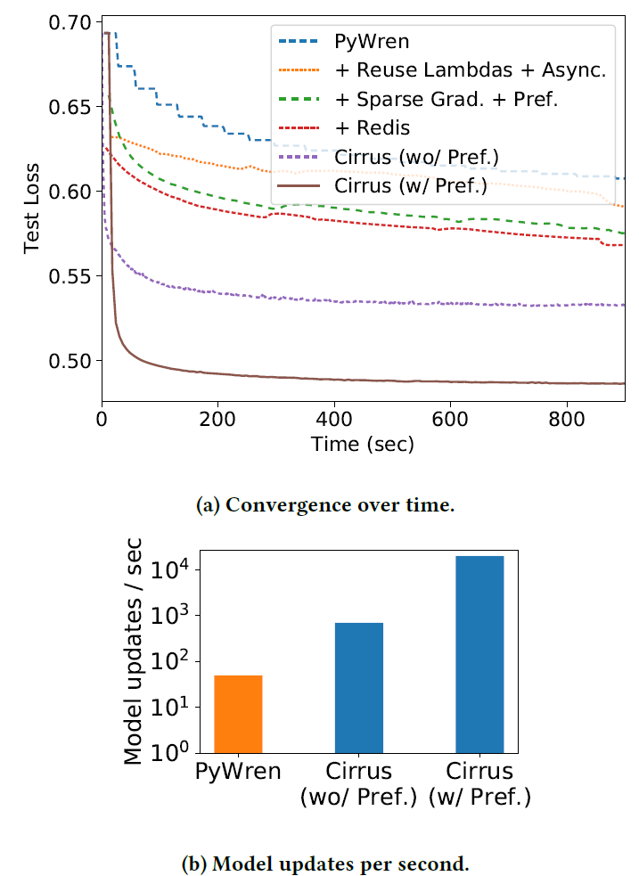 作者通过记录随时间变化的测试损失来测量这两个系统的性能(图 2)。对于 PyWren,作者在实现每个优化之后报告这个值。作者累计实现了以下优化:(1)跨迭代重用 Lambda;(2)使用异步 SGD 进行小批量预取;(3)使用低延迟存储(Redis)代替 Amazon S3;(4)使用具有多 get 操作的稀疏数据传输。我们观察到这些优化显著改善了 Pyren 在 600 秒后实现的最终测试损失(从 0.61 到 0.57)。尽管有了这些改进,PyWren 仍然比 Bosen 慢得多。进一步的性能分析表明,PyWren 存在一些开销,例如序列化 / 反序列化数据,以及使用接口不适合 ML 工作负载的远程存储(例如 Redis 或 S3)。这一结果表明,在设计无服务器计算框架的早期,需要仔细考虑 ML 工作负载的性能需求。