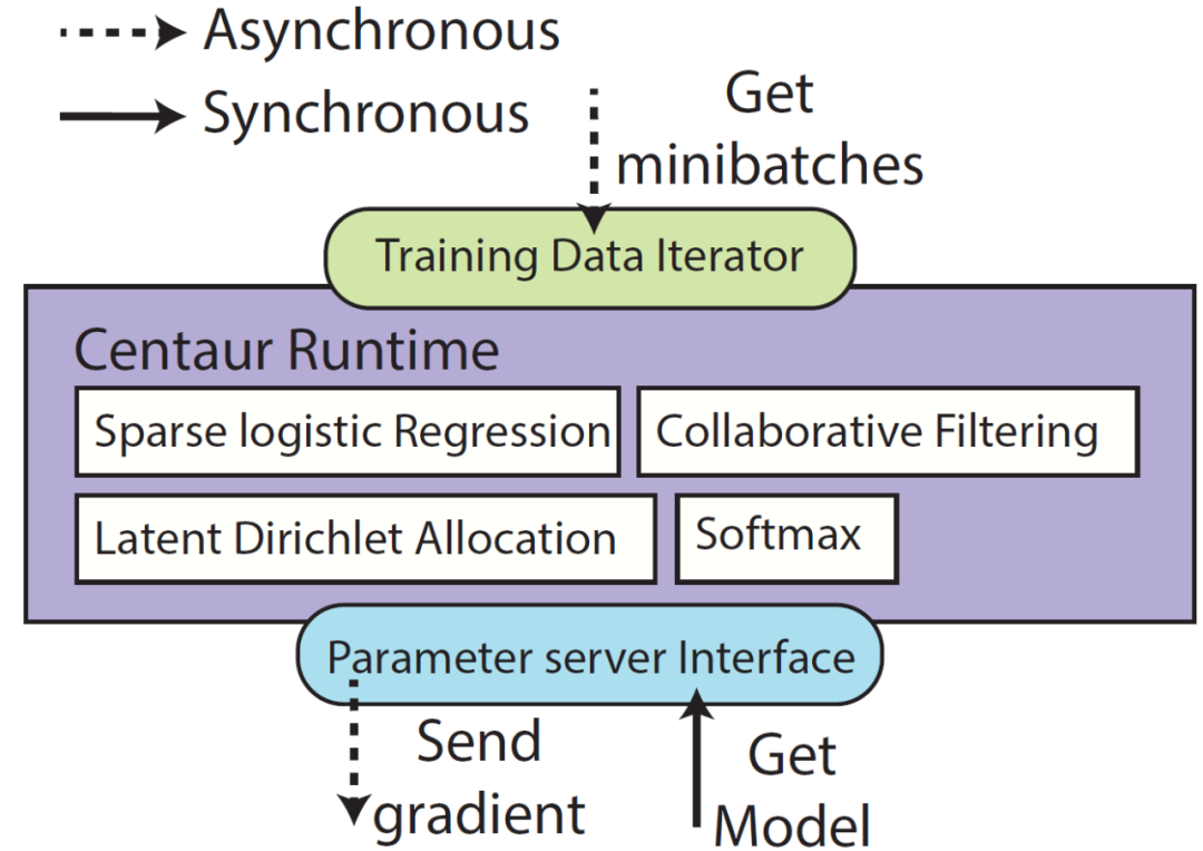 最后,Cirrus 提供了一个运行时(Runtime),它封装了系统支持的不同计算之间共享的所有函数。如图 5,Cirrus 的 Runtime 为 ML 计算提供了通用抽象(General abstractions)和基本数据类型(Data primitives)用于访问训练数据、参数模型和中间结果。这些可用于向 Cirrus 添加新的 ML 模型。为了简化新算法的开发,Runtime 提供了一组线性代数库。Cirrus 的初始版本使用外部线性代数库如 Eigen 进行梯度计算。为了减少 Eigen 处理序列化和反序列化数据的时间,作者最终开发了自己的线性代数库。对于数据访问,Runtime 提供了一个由本地循环缓冲区支持的基于 minibatch 的迭代器,允许 worker 以低延迟访问训练 minibatch。此外,它还提供了一个高效的 API 来与分布式数据存储进行通信。