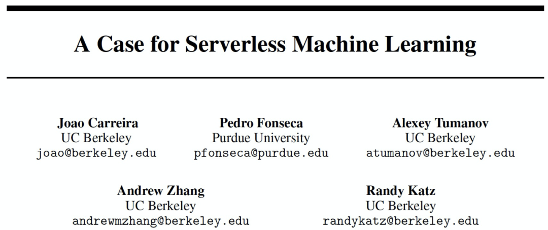 [2] Joao Carreira, Pedro Fonseca, Alexey Tumanov, et al., A Case for Serverless Machine Learning NIPS'18 http://learningsys.org/nips18/assets/papers/101CameraReadySubmissioncirrus_nips_final2.pdf