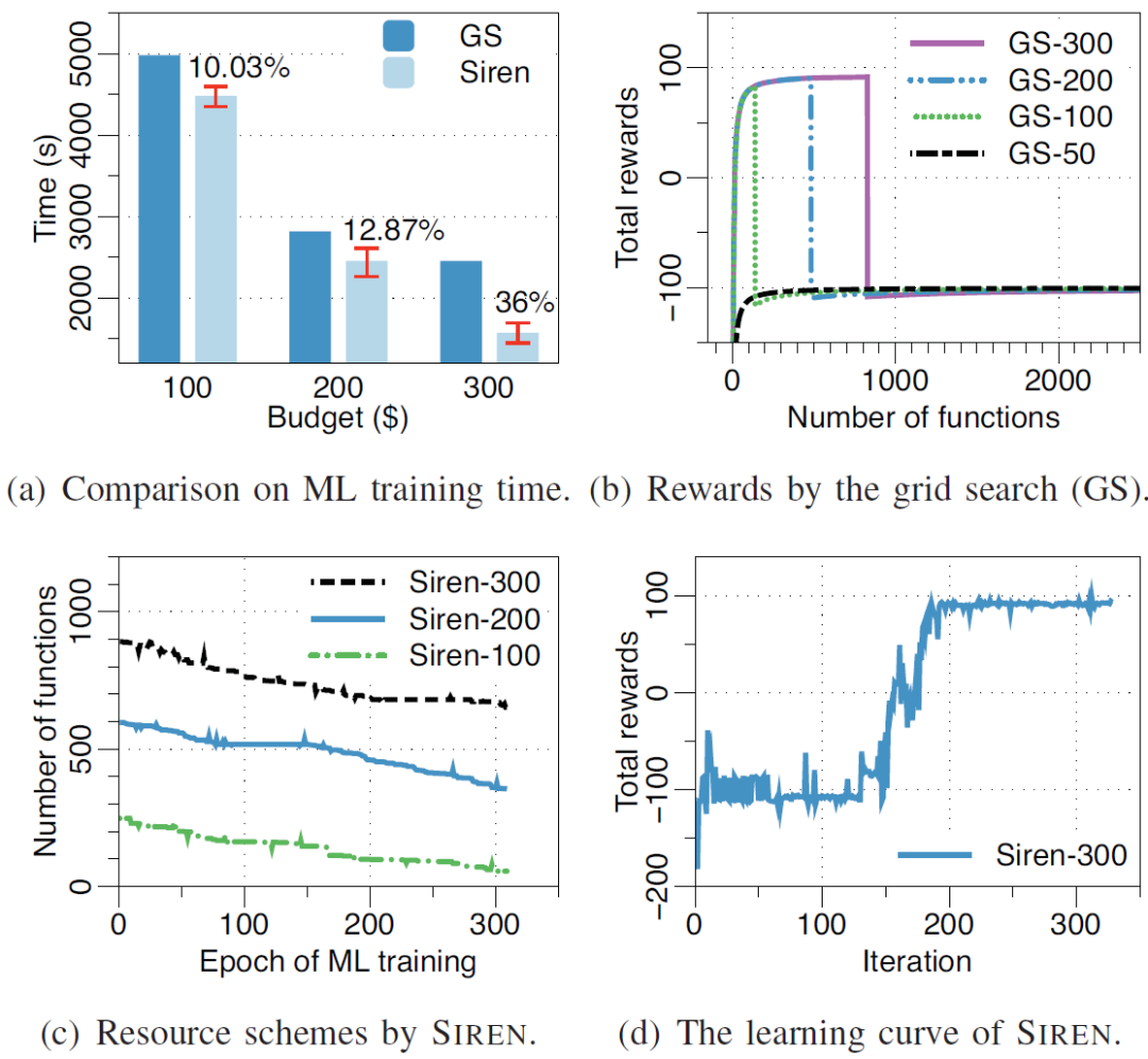 图 13 给出了 SIREN 与网格搜索最佳函数数量的比较实验。图 13(a)比较了通过网格搜索和 SIREN 实现的训练时间。与网格搜索相比,SIREN 在预算为 300 美元的情况下最多可减少 36% 的训练时间。如图 13(b)所示,网格搜索列举了不同预算下不同数量的函数的总奖励情况。SIREN 能够根据经验动态调整函数数量。图 13(c)给出了分配给每个 epoch 的函数数量。在前几个 epoch 中,SIREN 启动了大量的函数以快速降低损失值;在后几个 epoch,agent 减少了函数数量以节省成本。SIREN 的 DRL agent 通过与模拟的无服务器云的迭代交互进行在线训练。图 13(d)中的学习曲线表明,agent 通过探索不同数量的函数来学习最大化总奖励。agent 的训练在大约 200 次迭代之后完成。