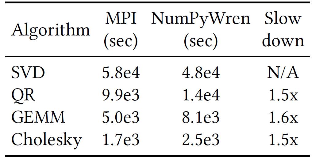 表 3. 在具有 512 个虚拟核的集群上,在 N=256K 的方阵上运行时,不同算法的 MPI 与 NumPyWren 执行时间的比较。